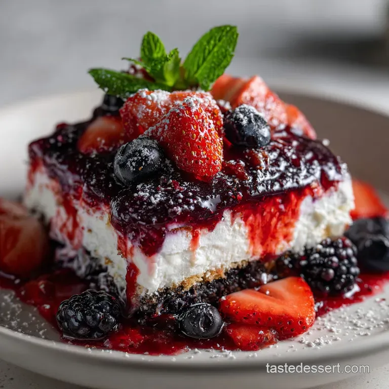 - Final assembly. Pour the berry mixture over the cream layer and refrigerate 4 hours until the top doesn't wobble when shaken. Top with the remaining 8 oz whipped topping and mint leaves before serving.