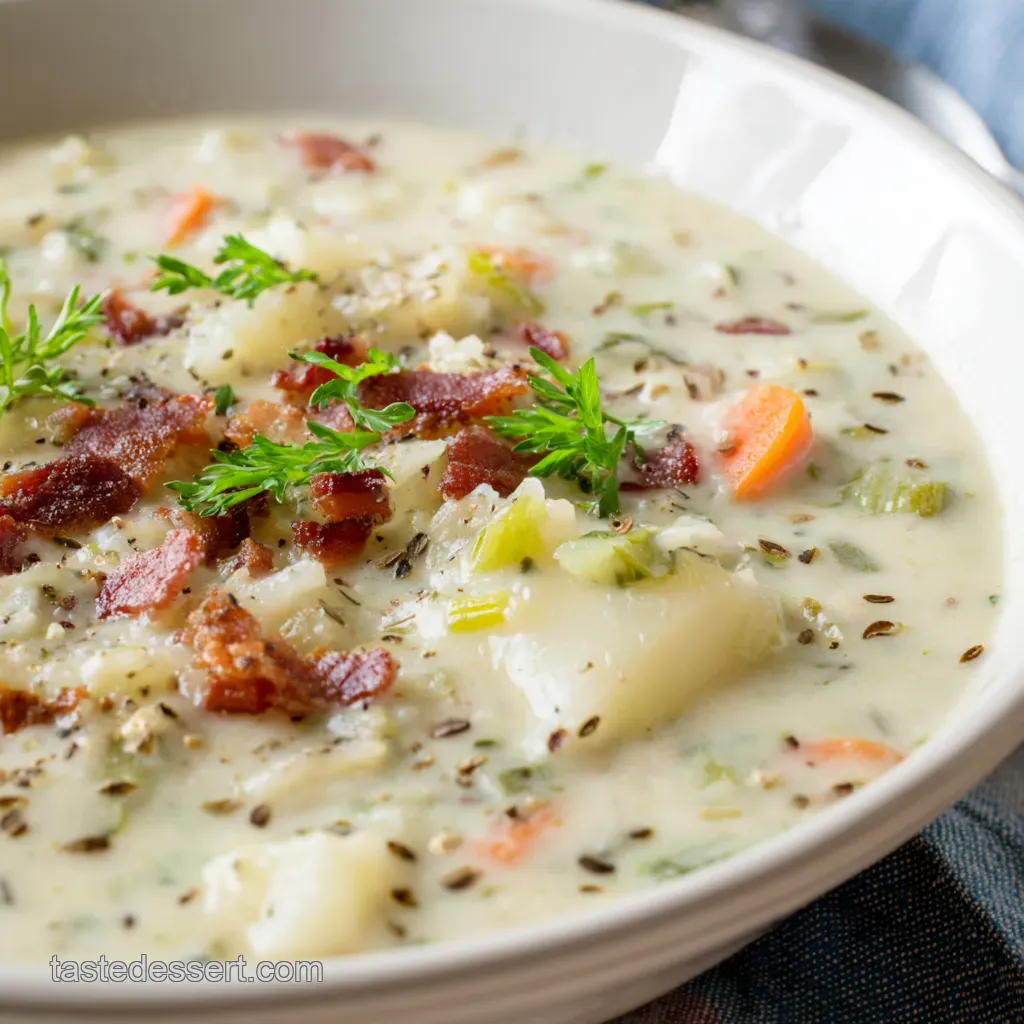 Presentation matters, yeah? For plating, think rustic charm. Ladle the creamy potato and cabbage soup into a bowl. A swirl of cream and a sprinkle of crispy bacon? Perfection!