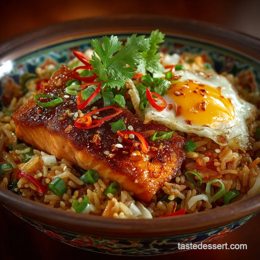 The richness and savoury depth of the fried rice and salmon benefit immensely from a sharp, acidic counterpoint. Serving the dish alongside a small bowl of spicy kimchi or quick pickled cucumbers provides a necessary palate cleanser.