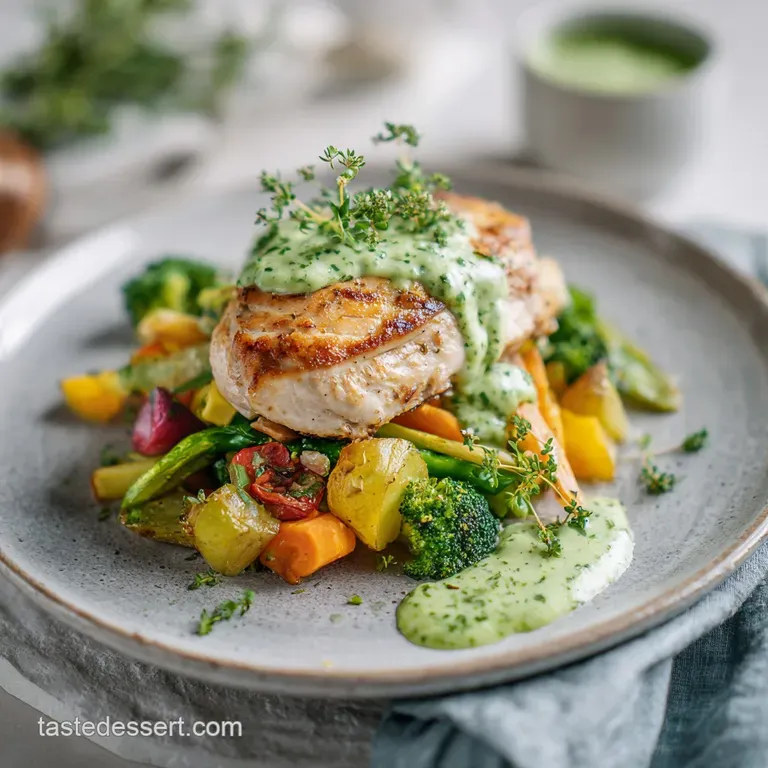 - Plating. Arrange the vegetables on a platter, top with chicken, and add a generous dollop of the herb sauce.