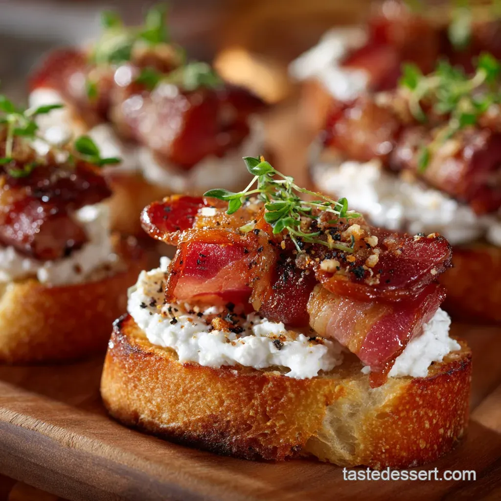 While the bacon and the whipped goat cheese spread can be prepped up to 24 hours ahead of time and stored separately, the final assembly should happen no more than two hours before serving to ensure the crostini base retains its proper crunch.