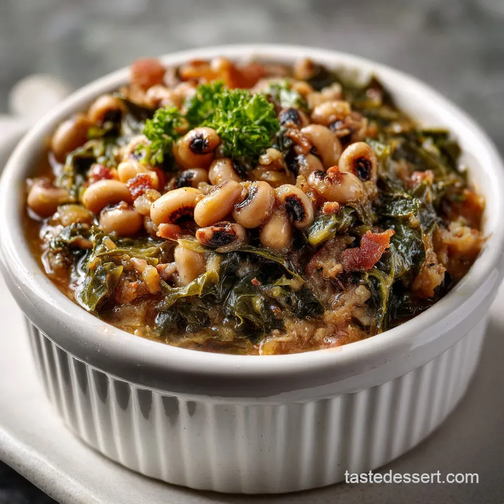 Here’s the deal: every ingredient has meaning. The black eyed peas symbolize coins, the collard greens represent paper money, and the pork (especially the hocks) symbolizes forward movement because pigs root forward when they eat. It's a culinary guarantee for wealth and progress in the year ahead!